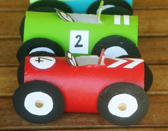 COCHE DE CARRERAS: Entre las manualidades con rollos de papel higiénico, los coches son uno de los favoritos de los niños. El trabajo no es difícil: primero hay que decorar la carrocería (sin olvidar el número, y si necesita inspiración, copie los coches de Fórmula 1). Después, con las tijeras, recorte un rectángulo que, doblado, actuará como un salpicadero. Cuatro ruedas de cartón cortadas y pintadas completarán el efecto.