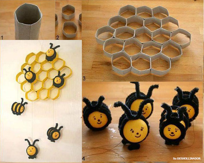 COLMENA: Esta es, al menos para mí, una de las manualidades con tubos de cartón más divertidas. Lo primero que debemos hacer es doblar el tubo para darle una forma hexagonal. Después debemos recortar varios trozos de igual tamaño y, a continuación, pegarlos uno al lado del otro para formar una colmena. Los más pequeños de la casa se divertirán pintando la colmena con témpera amarilla y poblándola con abejas que pueden hacer con los recipientes de los huevos sorpresa de chocolate. ¿Cómo hacer las rayas negras de las abejas? Podemos dejar a l@s niñ@s escobillones o limpiapipas de color negro ya que su interior es de alambre, se dobla con facilidad y está recubierto de pelillos. Es el material ideal para hacer tiras y antenas 🙂