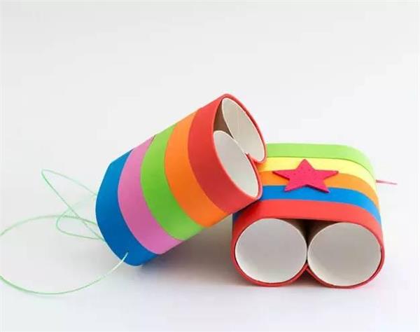 PRISMÁTICOS: Cogemos dos rollos de papel y colocamos pegamento por toda la superficie de los mismos. Después, colocaremos un papel estampado rodeando los dos rollos. Con ayuda de unas tijeras recortaremos dos pequeños círculos, uno en cada rollo y en los extremos, para poder insertar una cuerda que sujete los prismáticos. A continuación, recortamos un trozo de papel con forma de rectángulo para unir un rollo con otro y simular nuestros prismáticos. Debemos cortar una cartulina que tenga al menos unos 2 o más cm. de ancho; en cuanto al largo debe ser lo suficiente como para darle la vuelta a los dos rollos.
